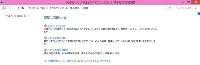 回復から「回復ドライブの作成」を選んで、8GBフラッシュメモリに再インストールメディアをつくります。また、再インストールの際にはプロダクトキーが必要になるので、それもチェックしておきましょう。