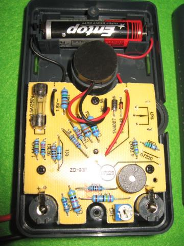 このテスターはブザーが付いていて80オーム以下の導通だとブザーがなります 圧電ブザーなので小さい音です 値段の割りに造りは良いほうだと思います 電池用に1.5V , 9.0V用のチェックレンジが設けられています でも、電池は本当は電流で見ないと判らないですね