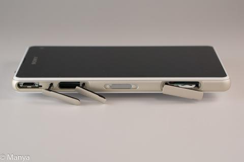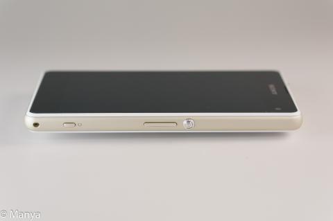 最もXperiaらしさを感じる右サイドデザイン。緩やかな円弧を描く金属パーツのサイドパネル上に、