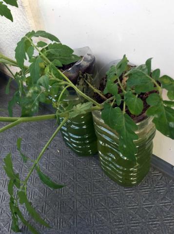 ペットボトルの下の部分はアルミホイルを貼ると藻が付かないが、別に生育に問題無いので、今は付けていない(面倒くさいだけですが)