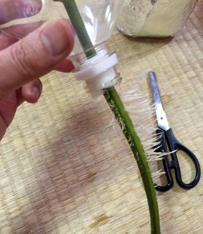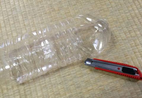 定植するのはペットボトル、2Lの物を上の部分をカットする、写真ではカッターで切っているが、植木バサミで十分だ