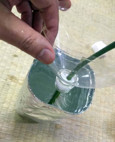 入れたら切り取ったペットボトルの上の部分を逆さまにして、差し込んで落ちない様にスポンジで蓋をする