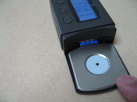 手前側の金属プレートが若干浮いていて、白い丸部分に試料を載せるとカウントします