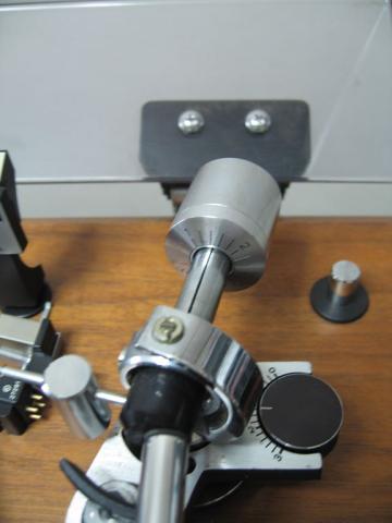 ↓画面でトーンアーム最後尾の丸いウエイトを回転するとトーンアームの水平バランスが取れます そこでバランスが取れたときのウエイトの目盛りをゼロにセットして(この目盛りはウェイトに関係なく自由に廻せます)、内側に(カートリッジ側に)廻すと針圧が手動でセットできます(針圧は1.5gとか2.0gとか)カートリッジに合わせた針圧を掛けられます