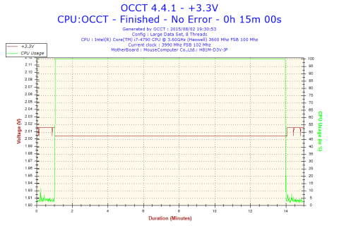 ちなみにOCCTテストを行いましたが、+12Vの結果が空白……というか項目自体が存在してない……。調べてみましたところおそらく、GIGABYTEのマザーボードが特殊な電圧センサーを使っているために起こる現象のようです。一番気になる12Vがわからないとは……ぐぅ。ひとまず+5Vと+3.3Vの電圧だけ見てみます。全体的に電圧低めです。