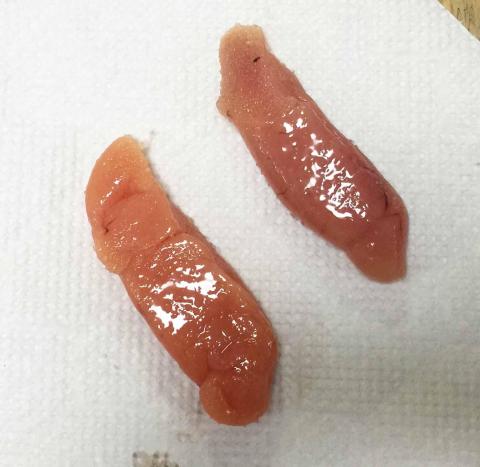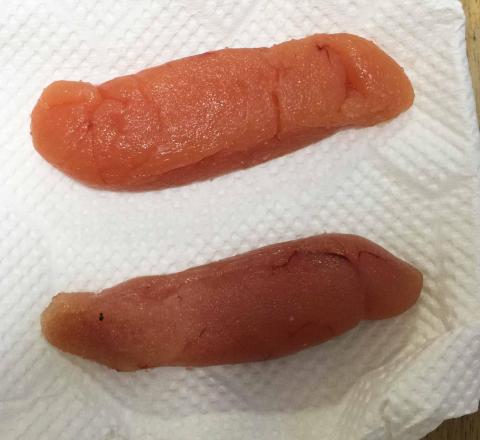 スーパーマーケットでたらこを買ってきまして、3腹分入っていましたが、失敗してしまった時を考え、2腹のみを使います・・・(^_^;)