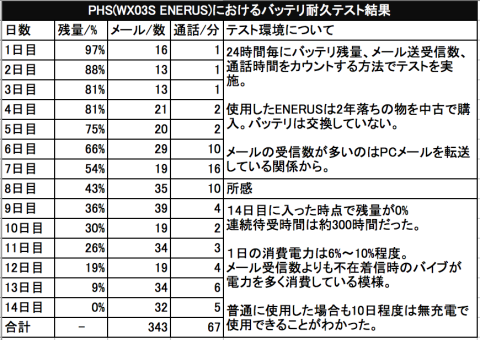 以下の表は実際に充電をしないでどれだけ連続使用ができるか試した結果ですが、二週間近く連続で使用することができました。バッテリーコンディションがよければ(テスト機は2年落ちのバッテリ)もっと稼働時間が増えるでしょう。