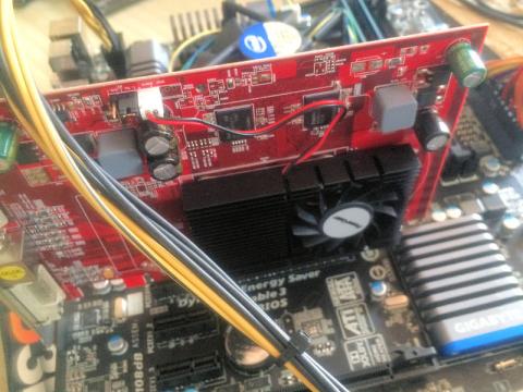 もっとも、ミドルクラスのビデオカードでありながら、消費電力は45W程度ということで、その省電力性能は素晴らしいものでした。その意味では上のようなバラック状態での動作には向いていたといえます。