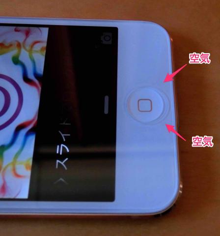 手順に從って、ガラス面をキレイにし、保護フィルムを載せて、真ん中から外側へ空気を抜いて密着させていった、ほほキレイに貼る事が出来たが、ボタンの分の穴の外側だけ空気が抜け切らない、まあ、このぐらいは仕方ないのかな?