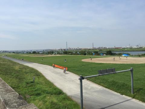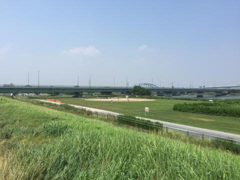 手前で、野球の試合をしていて遙か彼方でサッカーの試合をしています(夏の河川敷の一コマです)