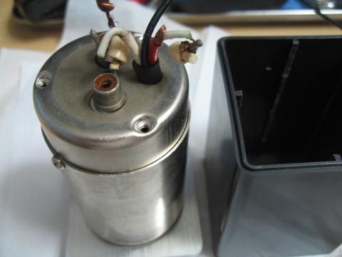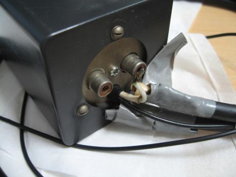 金属ケースから出ているのがオリジナルのケーブル 内部は昇圧トランスですが前面のツマミを外さないとトランス自体が出てきません 現在ではオリジナルコードを延長するしかないようです
