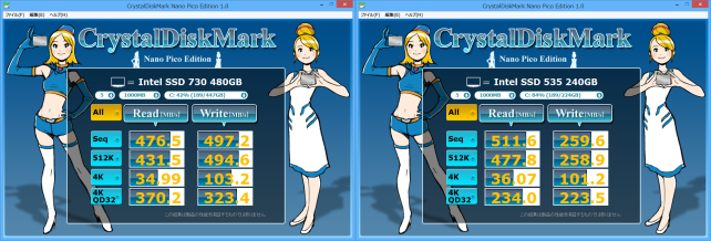読み込み速度では535が上回っているところもありますが、やはり書き込み速度では730がかなり上回っています。