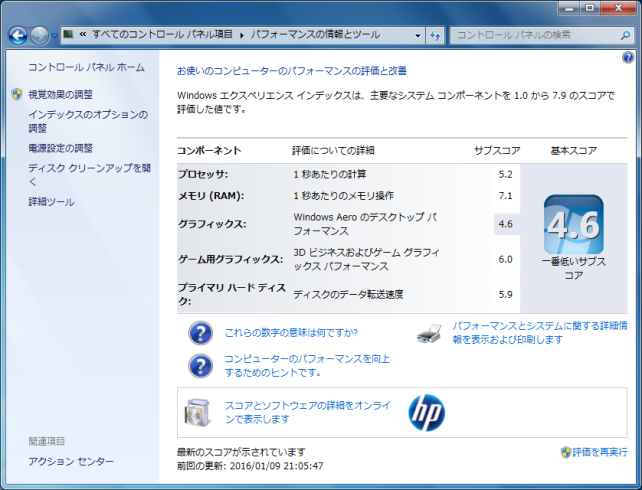 プライマリディスクの値が、HDDの 5.9 から 7.9 (Windows7の最大値)になってます。