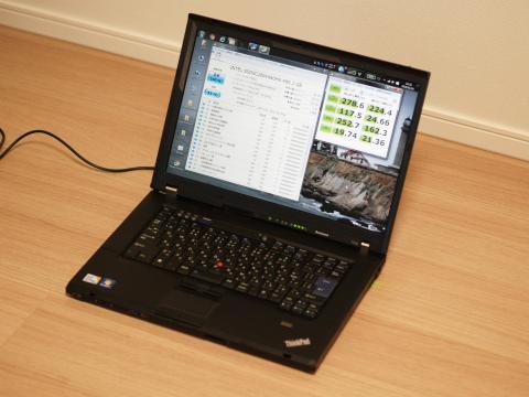 Core2のThinkPad T500にも入れて見ました。SATAが3GB/sまでなので、このSSDを付けても性能を生かし切れないのは重々承知ですが、入れ替えの効果はむしろこちらの方があるかも知れません。
