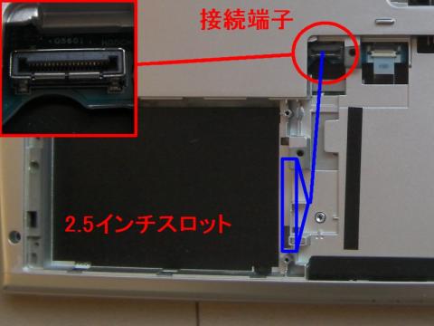このノートPCを入手してすぐに、一度カバーを外して2.5インチストレージ用のスロットが空いているのを確認していましたが、今回改めて2.5インチストレージ用のスロットを確認してみたら、問題がありました。スロットはあるのに、接続用の端子(ケーブル)が実装されていません。