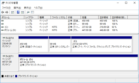 容量200GB以下だったシステムパーティションが237.92GBに増えました。増設した大容量SSDの447GBを足すと合計で684.92GBになりました。