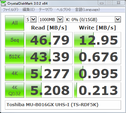 読み込みが約46MB/sと30MB/sの公称値と比べてかなり速いという結果になりました。安価な製品だけあって、512Kの書き込みはかなり遅めです。