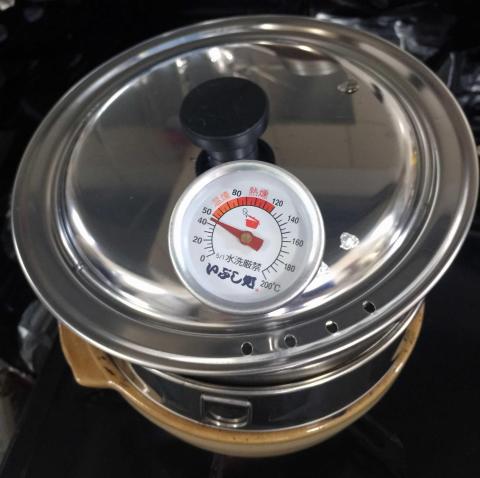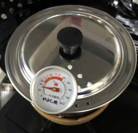 20分間弱火でスモークします、その後消して10分スモーク、ほぼ50度固定になりました