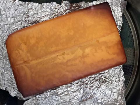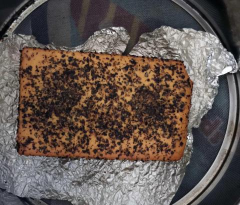 これは下段の皿で、10分燻製(推定温度70度)して、その後10分放置の状態です、ひっくり返しました