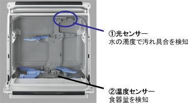 「ダブルセンサー制御機能」は、「標準」コース運転時に、「光センサー」と「温度センサー」の2つのセンサーが働きます。庫内奥の背面ノズルに配置した「光センサー」で食器の汚れを検知します。「光センサー」は、洗浄水の通り道に配置した一対の発光素子と受光素子からなり、受光素子が受けた光の量が多いときは汚れが少なく、光の量が少ないときは汚れが多いと判定するようにし、汚れの少ない場合はすすぎの回数と時間を減らします。