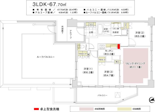 その為、下記の間取り図の赤色の場所に卓上型食洗機を置いてますが違和感が無いのです。