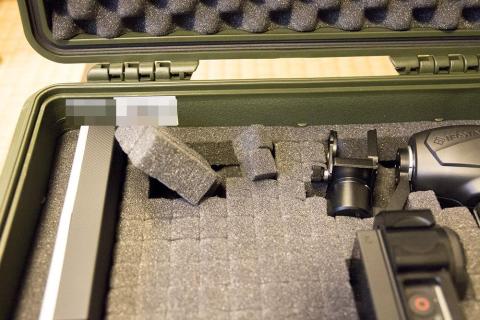 上記写真のままだとケースを振った時に中が少し動いているような感じがあったので、すき間のあるスペースのモノの下にウレタンを敷いてカサ上げしてやる事で振っても動かなくなりました。