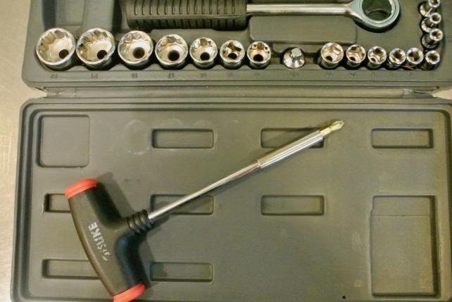 樹脂製のケースに各ピースがきちんと収まるし、ボックスレンチだけでなく、ドライバービットが付属し、それを利用する時に便利なT字型ハンドルも付属します。