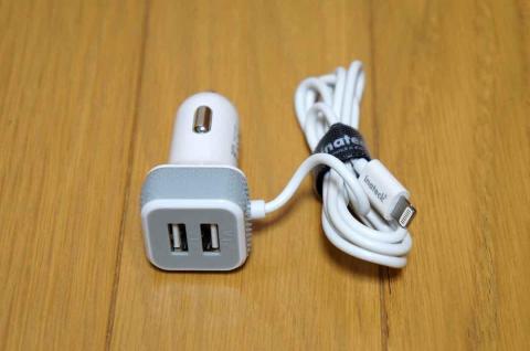 カーチャージャー本体にUSB2ポート、そして本体から延びるLightningケーブルがあり、同時に3デバイスの充電が可能です。