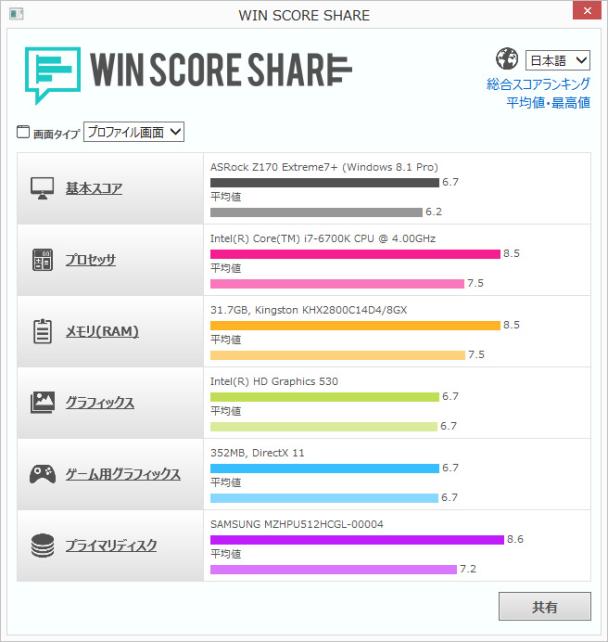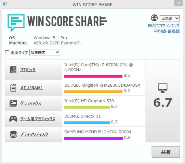 CPU内蔵のグラフィックス、インテル HD グラフィックス530の状態で、WinScore Shareを走らせてみました。