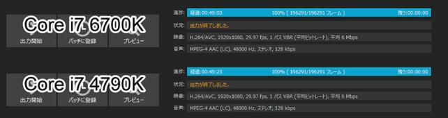 6700Kでのエンコードは、49分03秒、4790Kでのエンコードは、49分23秒でした。