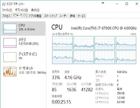 CPU使用率は30%台とムリはしていない感じ。Core i7-5960Xの時は明らかに