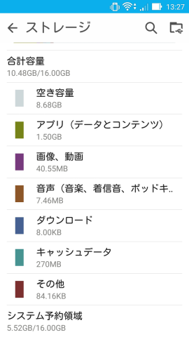 Zenfone 2 Laserの内部ストレージはメーカー標準で16GB。でもこれは何も入っていない場合の数値です。