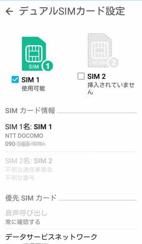 デュアルSIMなのでSIMの2枚差しを行うとSIM2が利用可能になり、このように見えます。