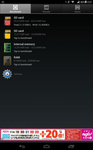 実運用計測として、dtabから「A1 SD Bench」というアプリを用いました。