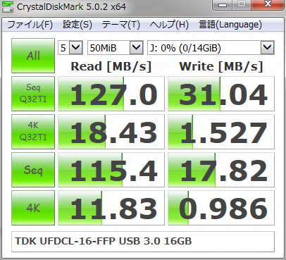 メインPCのUSBポートの挙動が怪しいので2ndPC+CrystalDiskMark 5.0.2で計測しました。