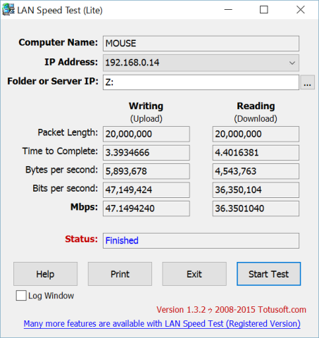 47Mbpsという速度が出ました。いずれも、実効スループットにまるで届いてないですが、原因として測定に使っているノートパソコンの無線LANがIEEE 802.11 b/g/nまでしか対応していない為だと思われます。