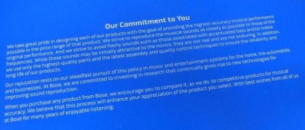 順序が逆転したが付属品と梱包に触れておこう。梱包は洒落た造りになっている。まず筒状の外装をとると上面に“Our Commitment to You”と描かれたBOSEの製品全体の指向性ともいえるものが書かれている「蓋」がある。それを開けると「蓋」の裏にはセッティングの概略が書かれていて、緩衝材を取ると本体とご対面。面白いのは箱の下側に引き出しのような構造でひとまとめにされた付属品が入っているという洒落た造りなっていること。