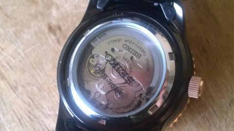 バックスケルトンですが、元は7Sムーブメントだったのでしょうか、見栄えを気にしたスケルトンではありません。SPECIAL EDITIONの文字は嬉しいけど、ローターの文字と被ってややゴチャゴチャ見えます。