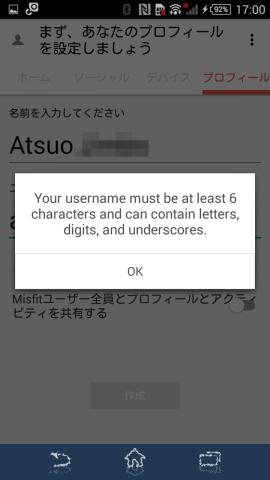 初期にはユーザー名を指定します。6文字以上でないと次のようなエラーが表示されます。