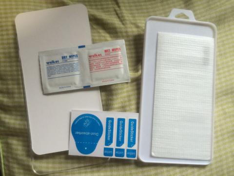 同梱品は意外と充実していて、ガイド用のシールの枚数も充分にありますし、画面清掃用のクリーナーも湿式と乾式がセットになっています。