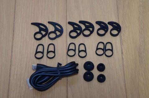 2種類のイヤーフックが3組ずつ、イヤーキャップが3組、クリップ、充電用ケーブルが揃ってます。