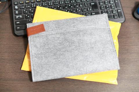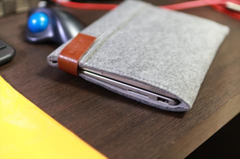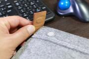フェルト生地でシンプルです。茶色のタブはマグネットになっており、中身が滑り出さないようにロックできます。