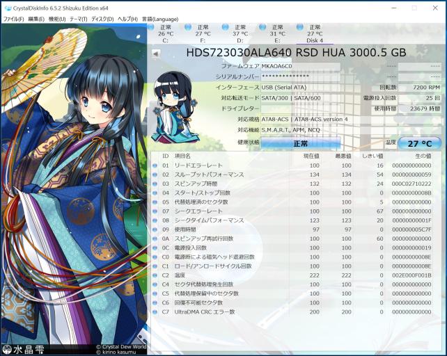CrystalDiskInfo読みでHDS723030ALA640 RSD HUA 3000.5GBと表示されています。