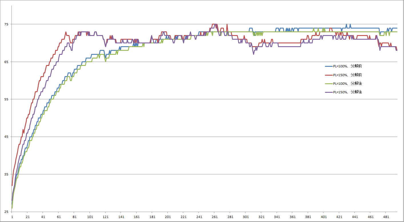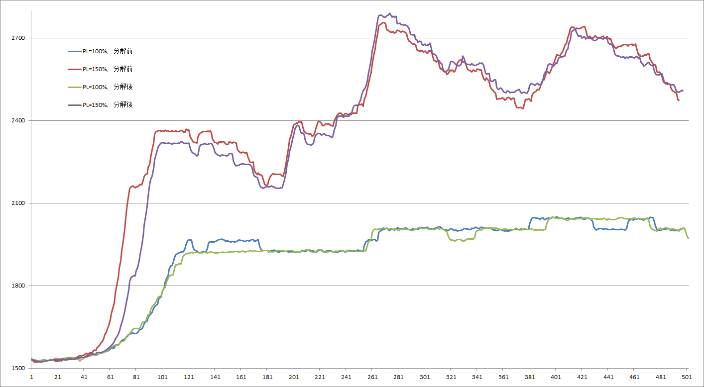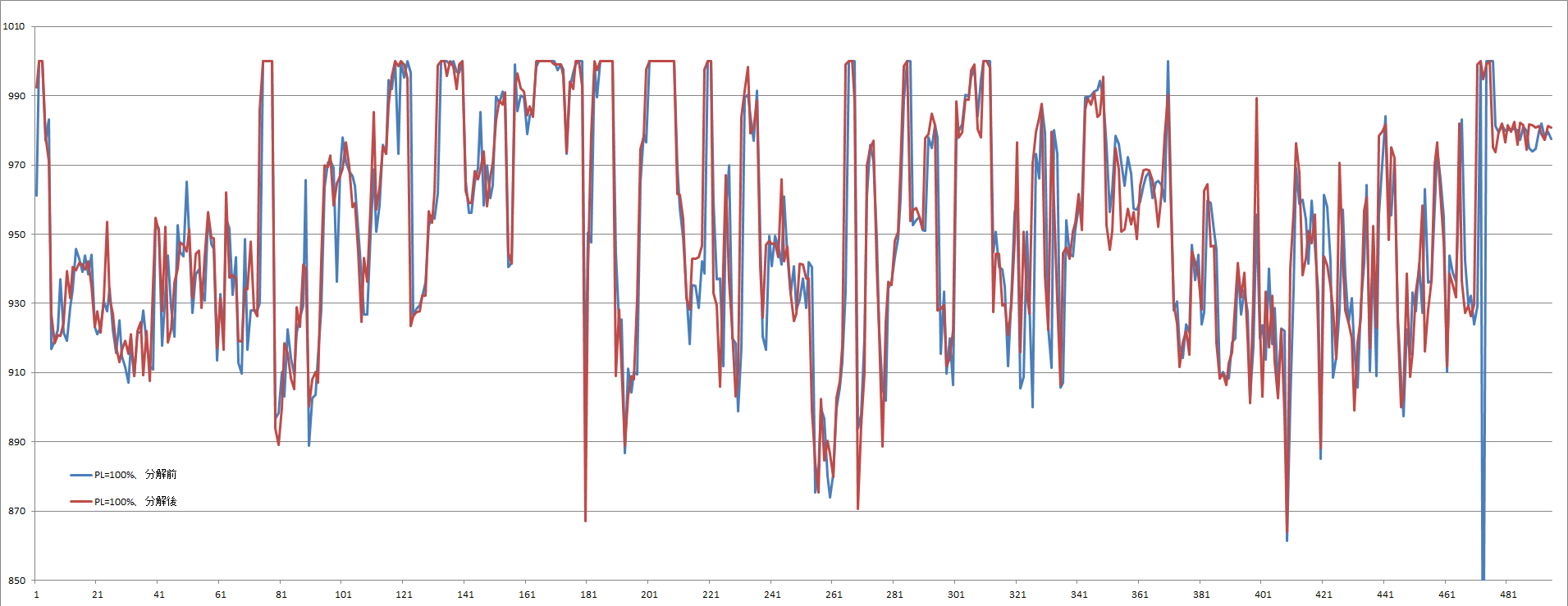 最後にPL100%の時の分解前後でのコアクロックの変動。