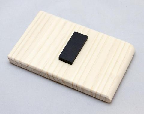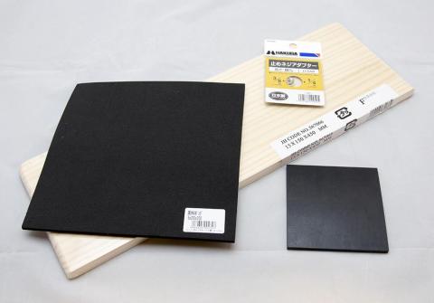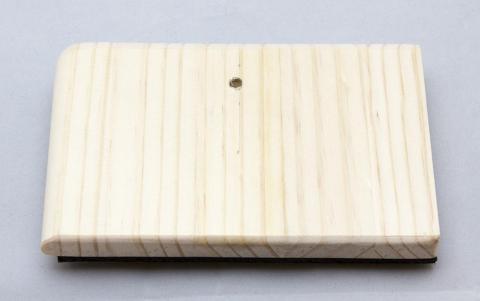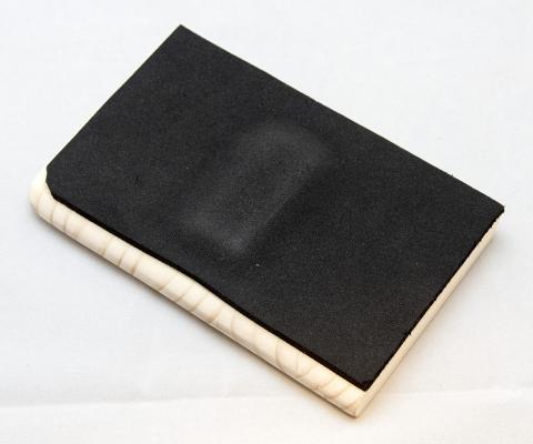 続いてスポンジ板を木版に貼り付けますが、今回の木板は元々縁がカーブしており上面の平らな部分は若干小さくなるので平らな部分に合わせてスポンジ板をカットし貼り付けます。
