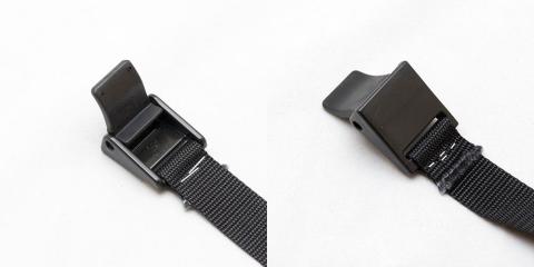 次は固定ベルトですが、十分な長さ(大体板の横幅の 3倍強)にベルトをカットし、バックルに留めます。