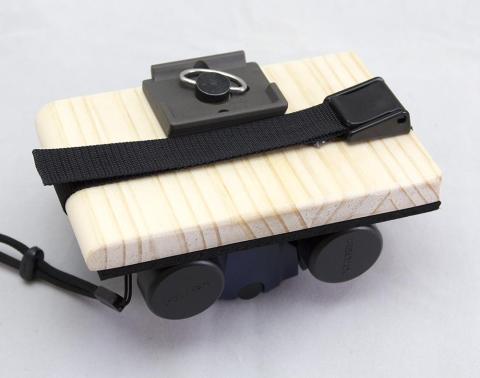 後は底面に三脚ネジ用の孔をを空ければ台の完成ですが、孔の位置を固定用のベルトに掛らない様に前方にします。