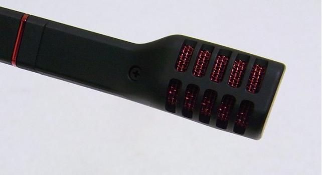 マイクブーム上に2本あるライン状の部材(赤色)の間はゴム製でフレキシブル構造になっており、位置を調整可能である。