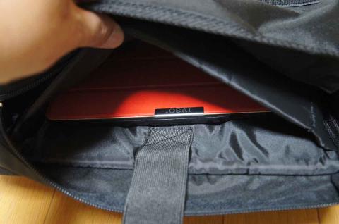 大口のポケットには、ウレタンを中に入れてあるので、ショックに弱いこのようなタブレットを入れると良いでしょう。