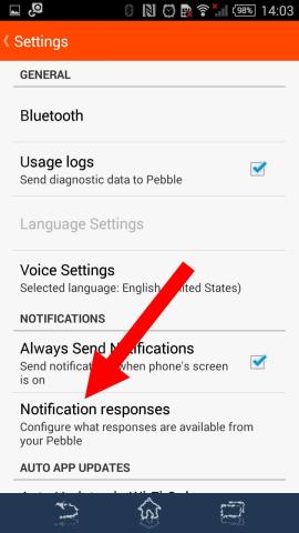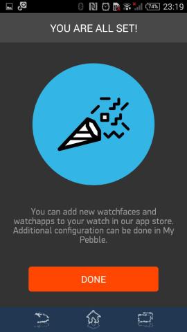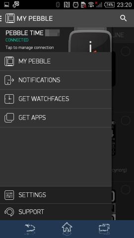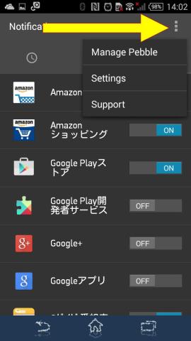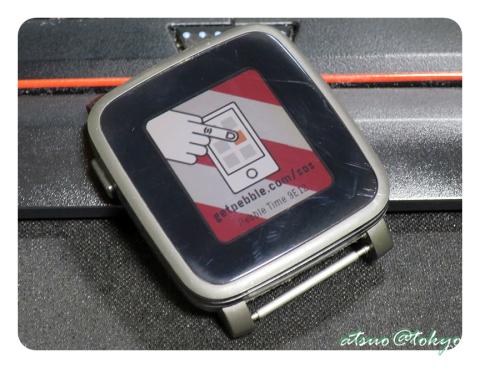 以下、画面遷移が分かるように右側に Pebbleの画面、左側にスマートホンの画面を貼ります。